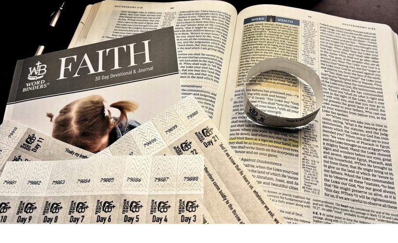 THE ANSWER: I believe that Word Binders will help you to meditate on the written Word of God throughout the whole day. We are told in Deuteronomy 6:8 “You shall bind them as a sign on your hand, and they shall be as frontlets between your eyes.” The Lord knows we are visual people. That is the way He created us. He clearly gives us the answer to this problem in His Word... Bind it on your hand so that you’ll see it throughout the whole day! All of this combined with a daily journal to remember yesterday’s victories, today’s tribulations, and tomorrow’s visions.